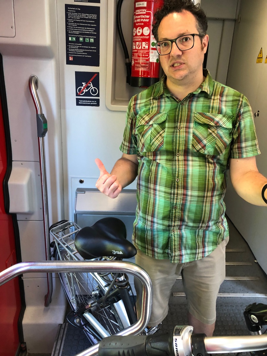 Oops, we got on the wrong rail car for my bike’s very first journey on an RE (regional express) train. Although we were very much in the way of those embarking (einsteigen) and disembarking (ausstiegen), we tried to be as nice as we could (there was no way to move to another car). And the Deutsche Bahn employee didn’t care; we expected a stern scolding but instead she just squeezed by us. Nor did the drunken young men who came through the car selling tiny bottles of alcohol (certainly an unsanctioned enterprise); in fact, they asked Jeff to hold their beer as they made sales. Bike in one hand, beer in another. No problem! See photo of Jeff returning said beer in slide show below!